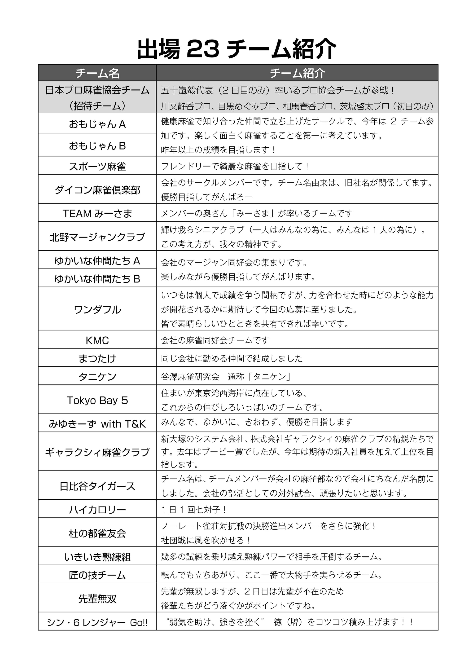 社団戦は4人以上1チーム編成で戦うチーム戦。今期は企業チーム、サークル・セット仲間チーム、麻雀教室チームなど22チームに加え、今年はゲストチームとして「日本プロ麻雀協会」チームが参戦し23チームでの戦いとなった。