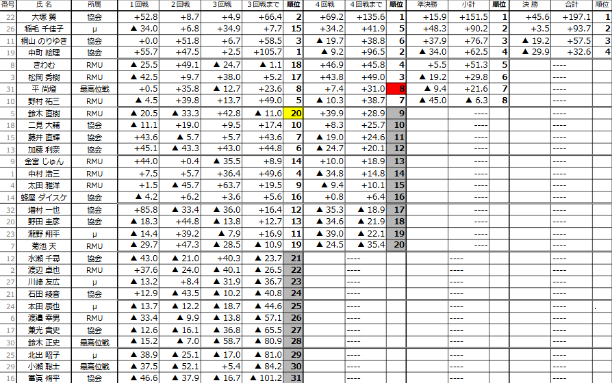 決勝には大塚選手・稲毛選手・桐山選手・中町選手が進み、大塚選手が1回戦から全てプラススコアで決勝も見事トップ。