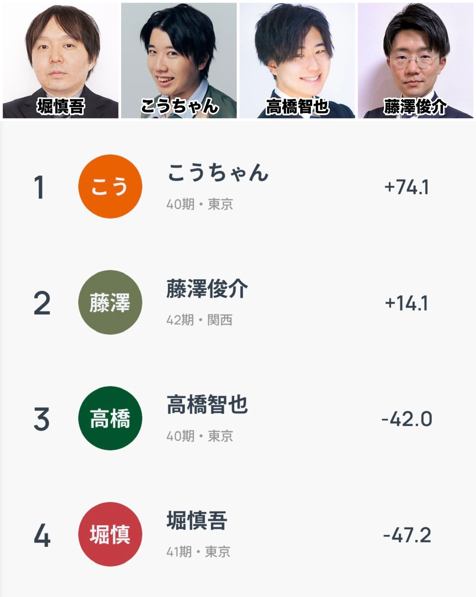 対局者は堀選手・こうちゃん選手・高橋智也選手・藤澤俊介選手の4名。