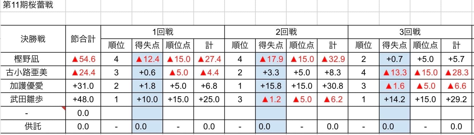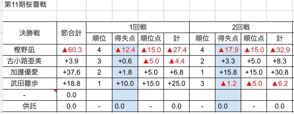 しかし東3局に加護選手は1000・2000のツモアガリで再び首位に立つと、東4局に満貫の出アガリで武田選手に10ポイントほどの差をつけ、さらに南1局は2000オールのツモアガリでさらにリードを広げる。