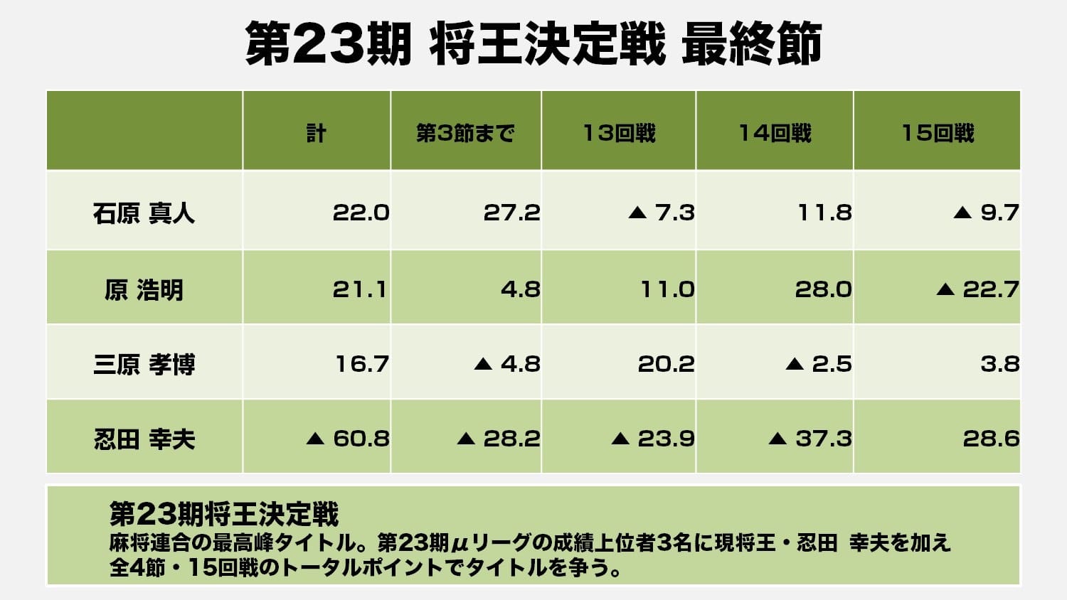12月29日(月)、第23期将王決定戦の最終節・13~15回戦の対局が行われ、対局の模様がABEMA麻雀チャンネルにて生配信された。