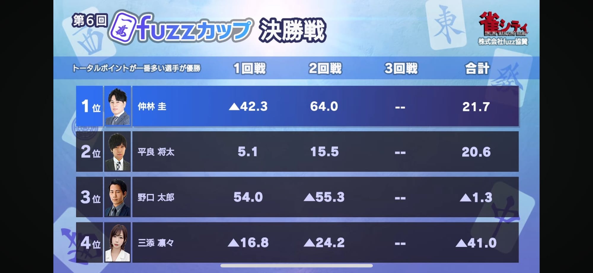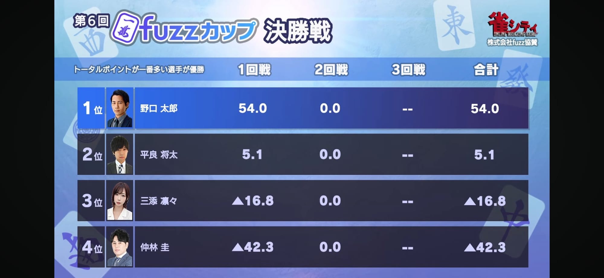 3月25日(水)17時より、第6回fuzzカップの決勝が行われ、対局の模様がYouTube「日本プロ麻雀協会」チャンネルにて生配信された。