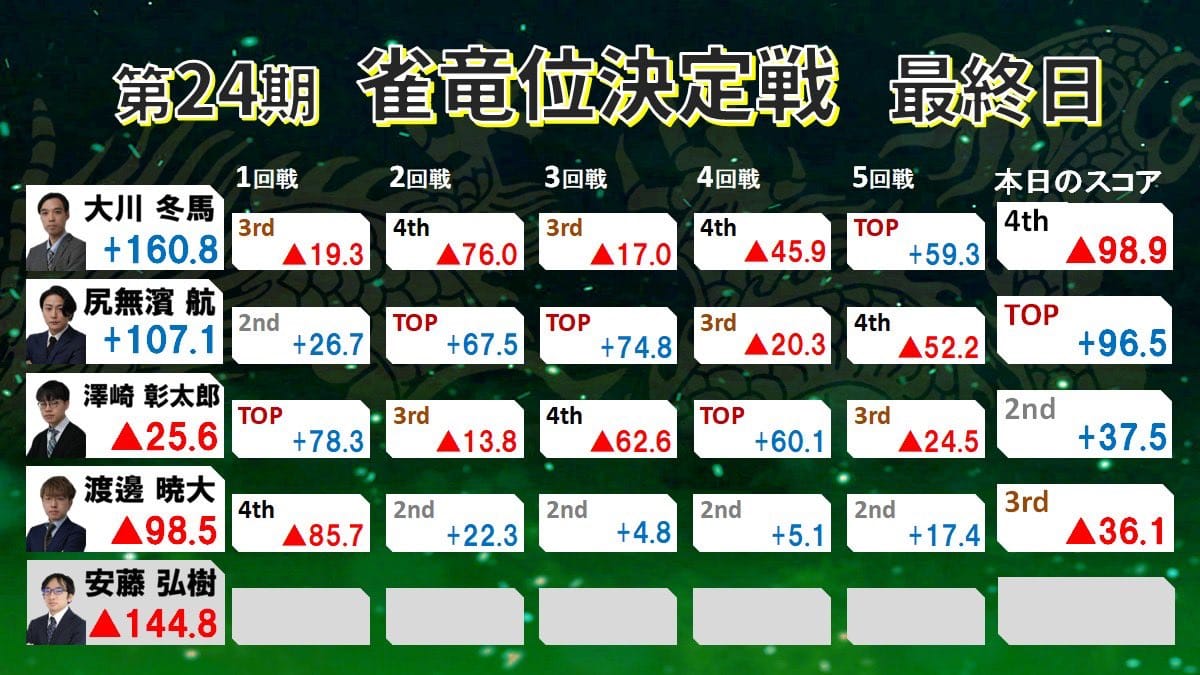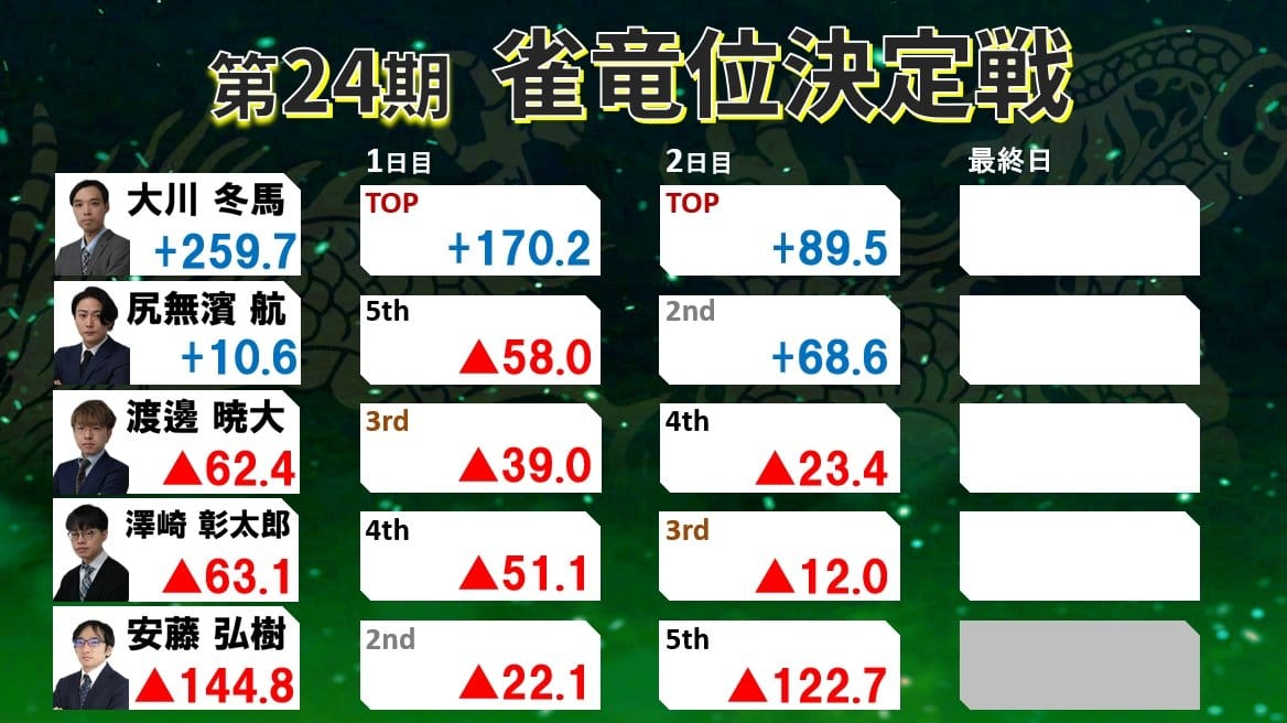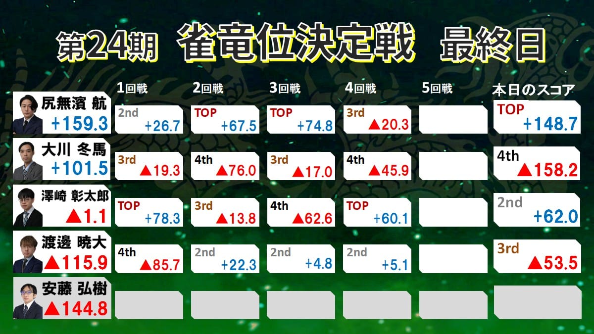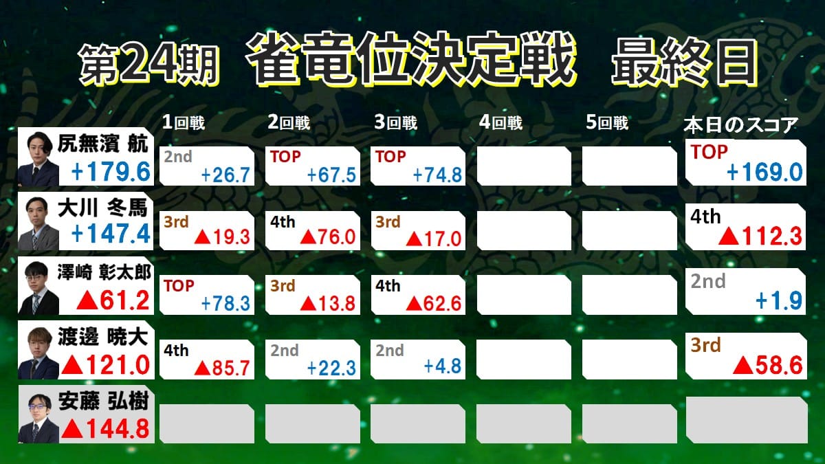 この日3・4・3・4と終始苦しんでいたが、最後にようやくトップ獲得で尻無濱選手を振り切り、見事第24期雀竜位に輝いた。