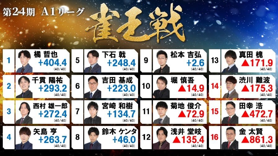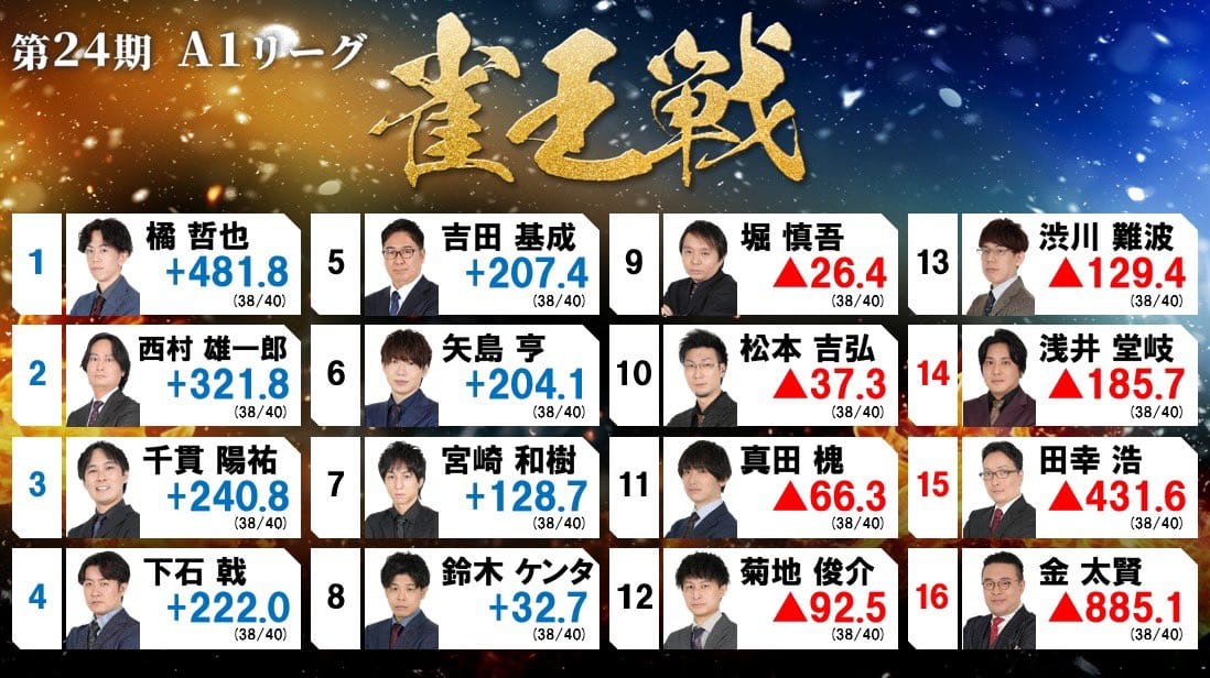 10月19日(日)12:00より、第24期雀王戦A1リーグ最終第10節の対局が行われ、4卓全てが同時生配信された。