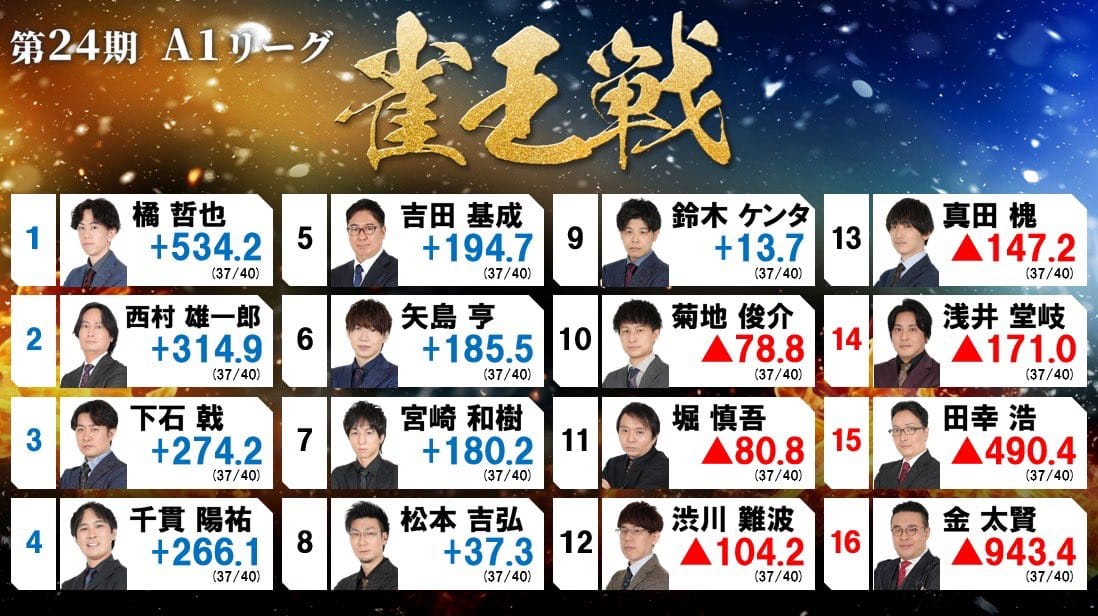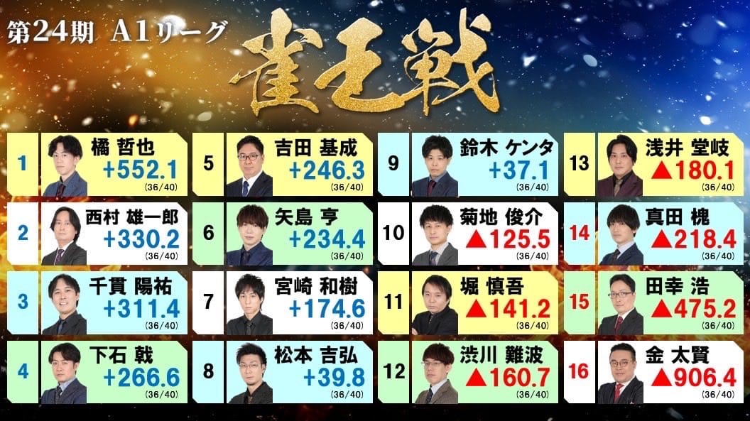 雀王決定戦進出を狙う上位陣は橘哲也選手は確定、西村雄一郎選手は自身がラスかつ別卓の矢島選手or下石選手・吉田選手・千貫選手の全員がトップでなければという条件のためほぼ確定かといったところ。