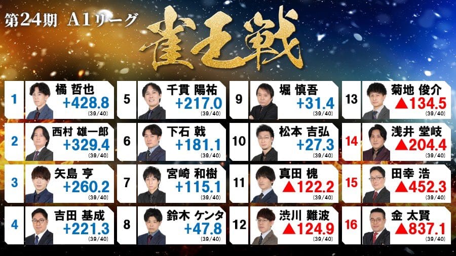 吉田選手・千貫選手は競っており、トップを獲得してもお互いトップ+矢島選手の2着以上・下石選手のデカトップで素点差勝負となるため別卓次第。