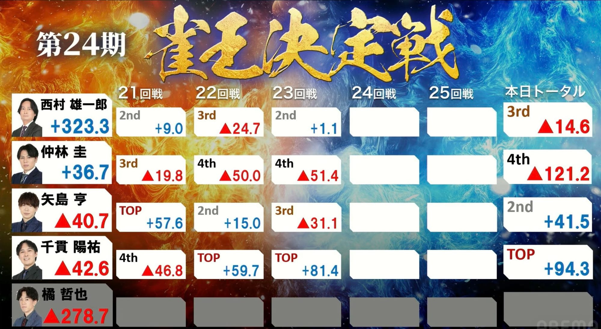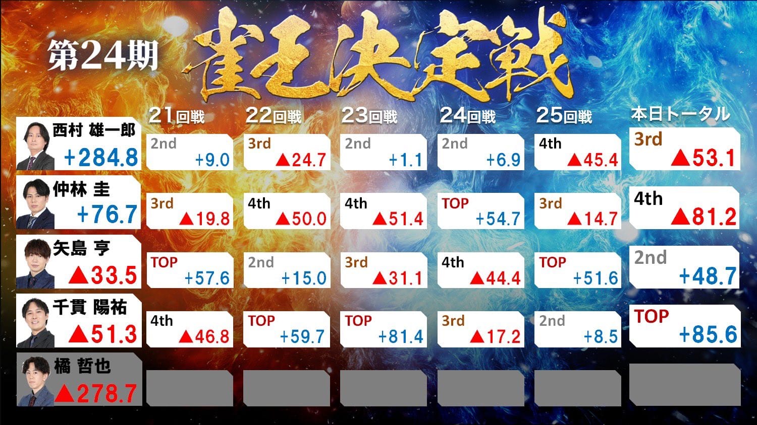 23回戦は東場の親番に猛連荘し、千貫選手が6万点超の大トップを獲得し一気に這い上がってくる。