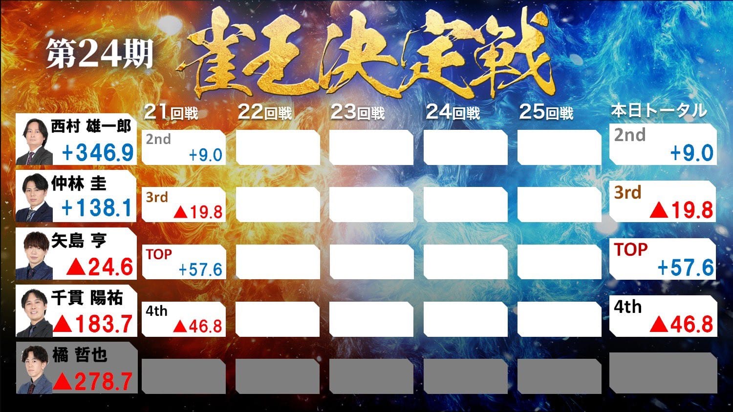 21回戦は西村選手が8000オールをツモアガるも、矢島選手が逆転しトップを獲得。