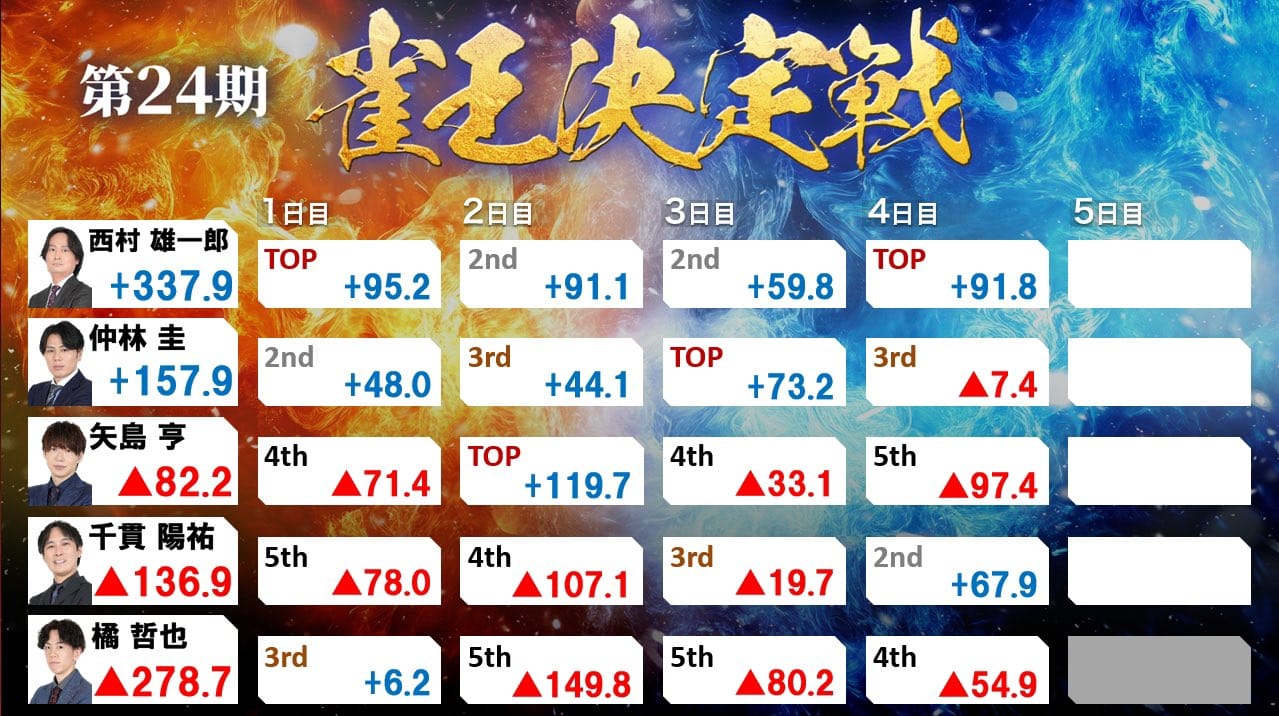 西村選手は最終日こそマイナスの結果とはなったものの、終始安定した麻雀でプラスを積み重ね続け、圧勝の優勝となった。