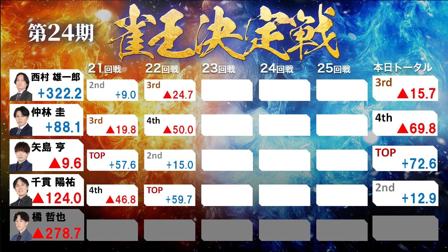22回戦はオーラスに見逃しからの一発ツモを決めた千貫選手がトップを獲得。