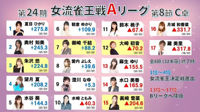 全ての対局を終え、永世女流雀王・逢川恵夢 の待つ決定戦に駒を進めたのは、夏目ひかり選手・奥村知美選手・朱沢悠選手・望月夏選手の4名。