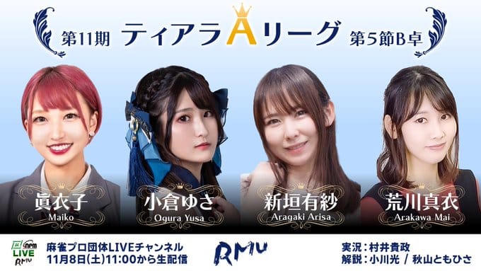 11月8日(土)、第11期ティアラAリーグの最終節となる第5節の対局が行われ、その模様がニコニコ生放送・OPENREC・YouTube「麻雀プロ団体LIVEチャンネル」にて生配信された。