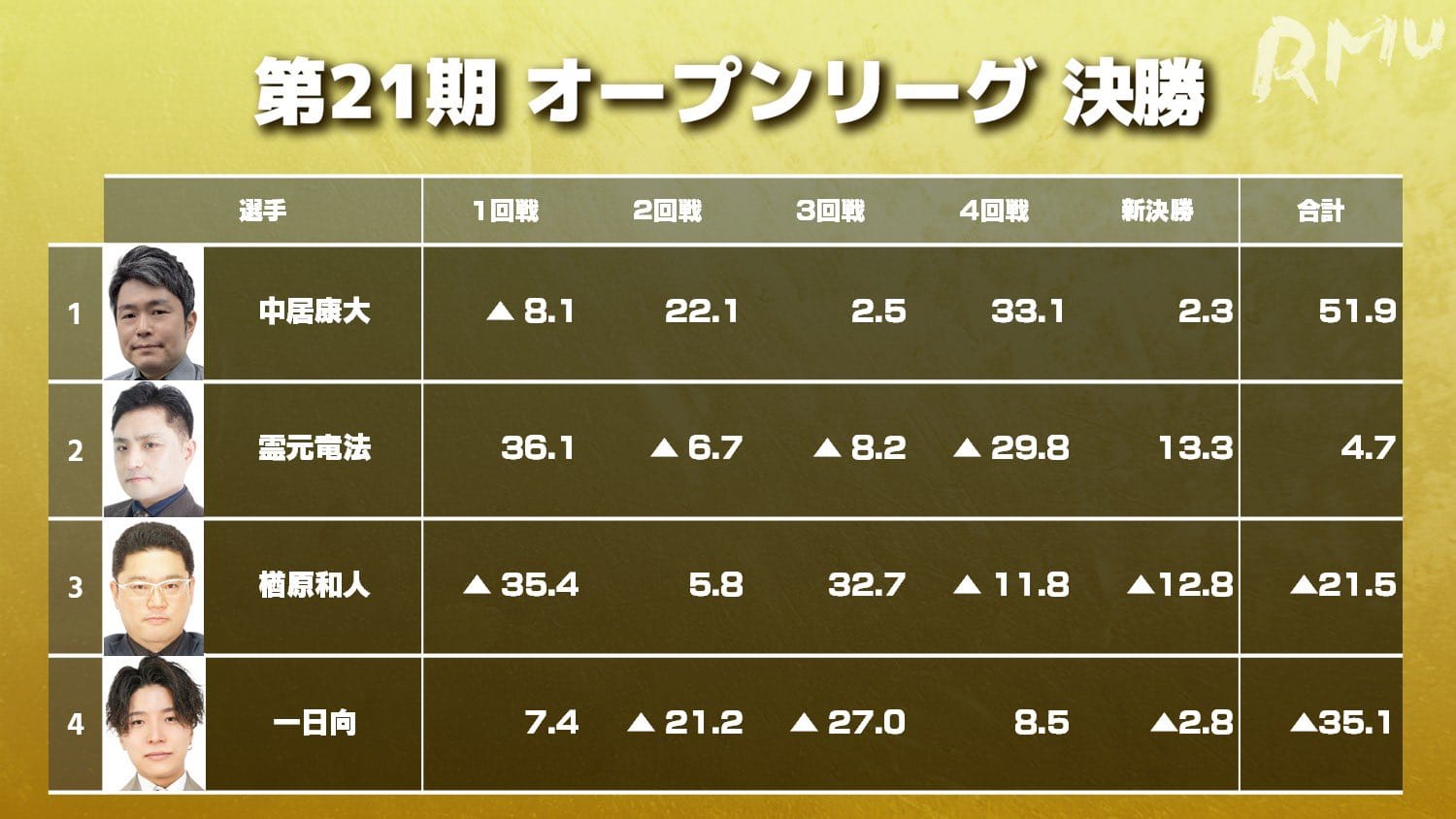 【RMU】第21期オープンリーグを中居康大選手が制す!