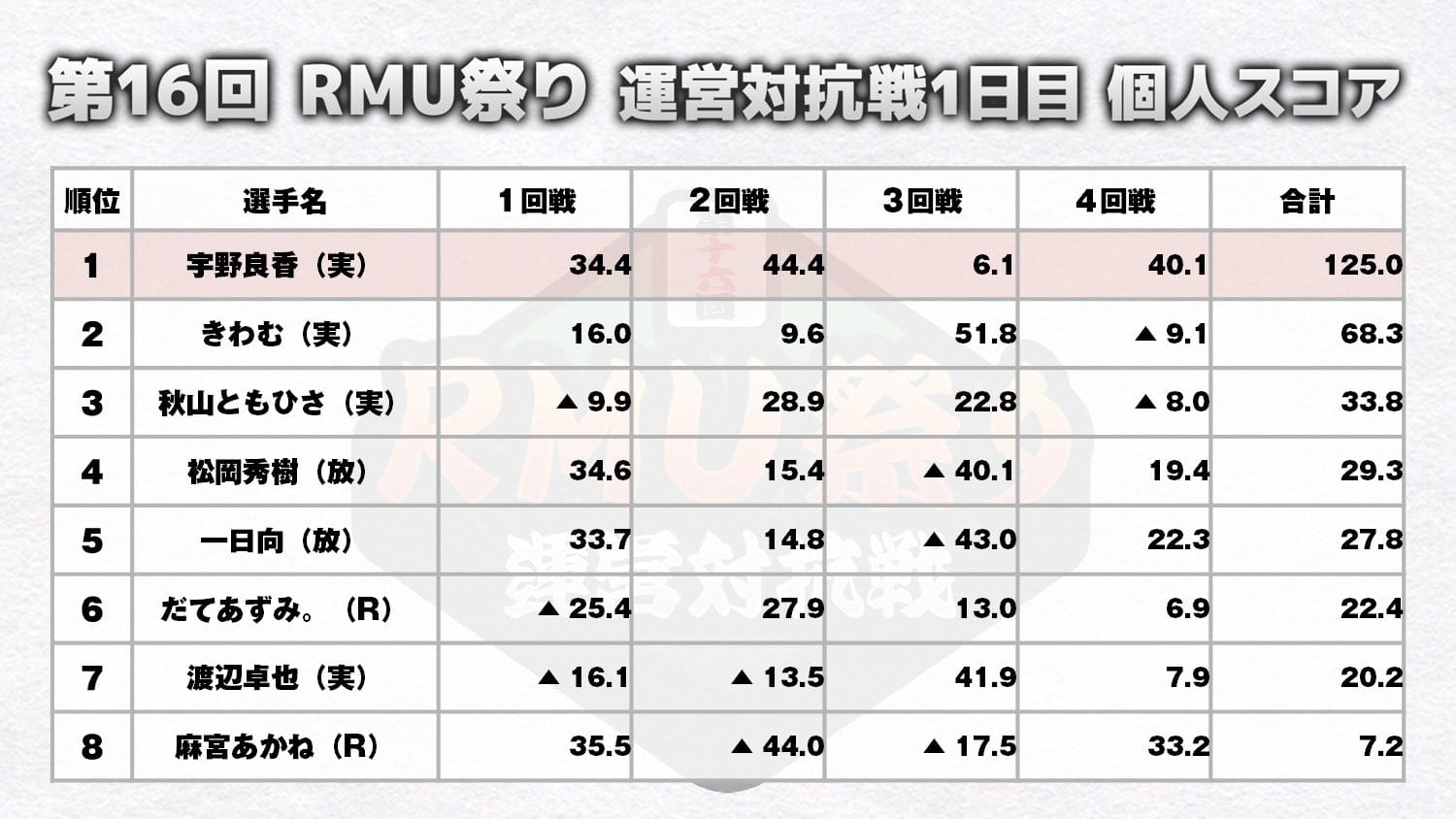 1回戦はRMUchチームが1位で+93.6ポイントと大きなプラスを獲得し2位に浮上。