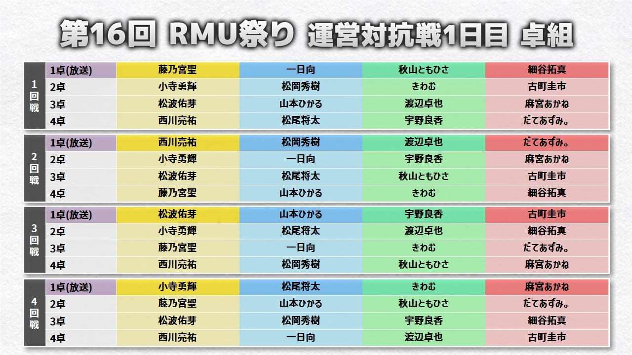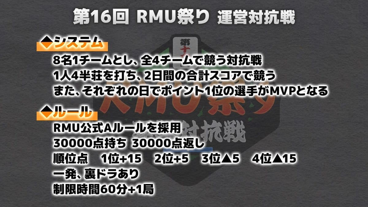 2月11日(水・祝)・15日(日)それぞれ11時より、RMUのお祭り企画「第16回RMU祭り運営対抗戦」が開催され、対局の模様がニコニコ生放送・OPENREC・YouTubeで生配信された。