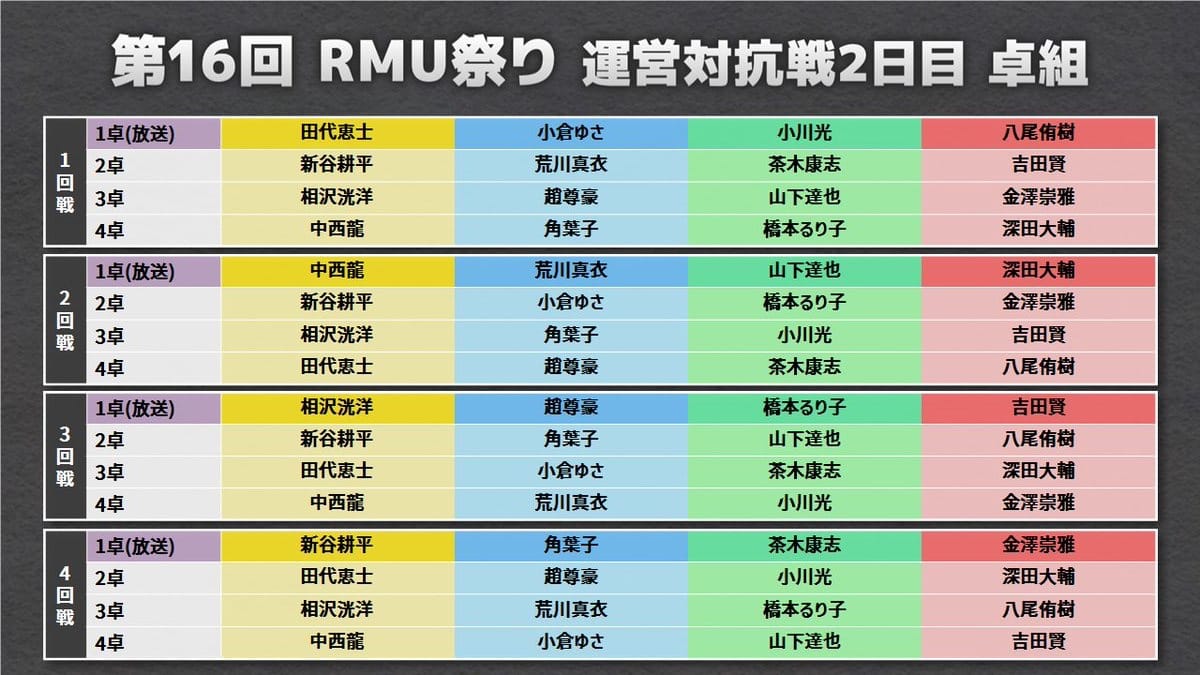 3位の会場運営チームはこの日一度もプラスで終えることができず、4位のRMUchチームは4回戦こそ+2.2ポイントとなったが、首位が抜けてしまっているため両チーム共に厳しい結果となった。