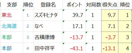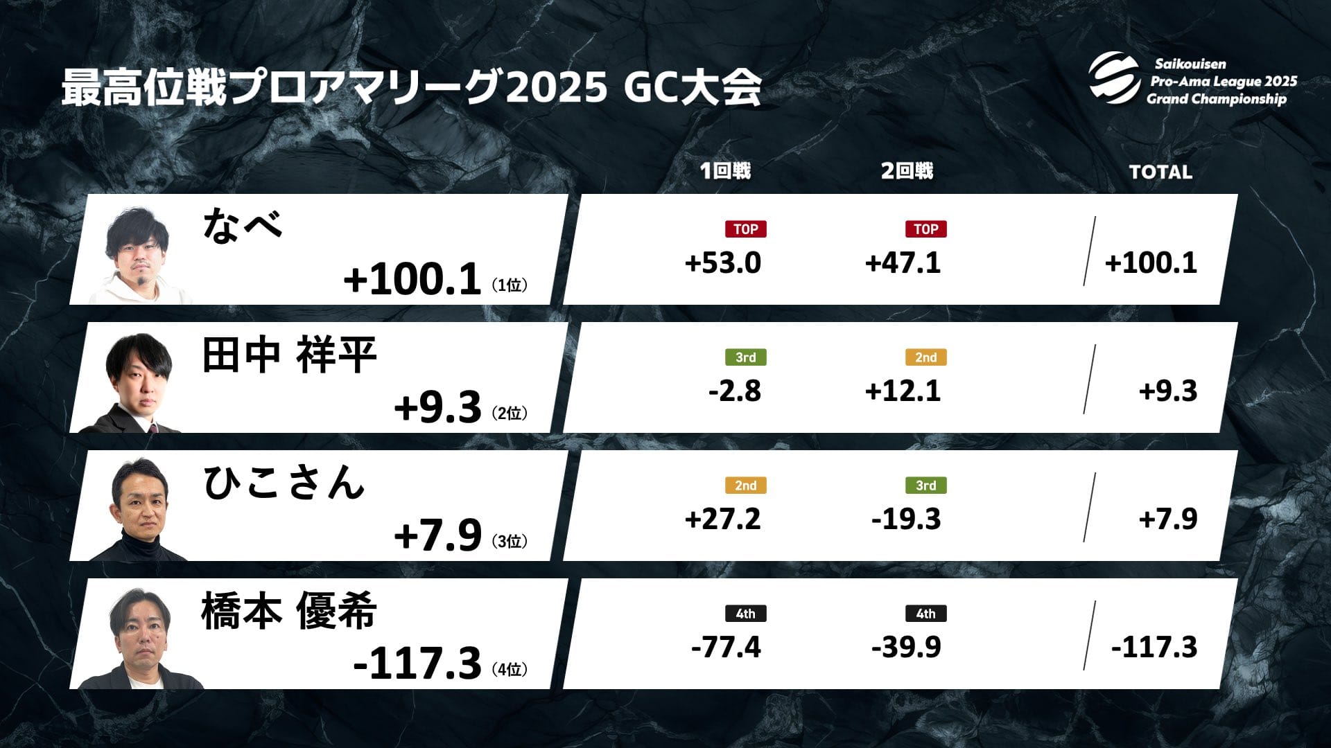 A卓からはスズキヒナタさん・吉積康博さん、B卓からはなべさん・田中祥平選手が決勝へ進出。