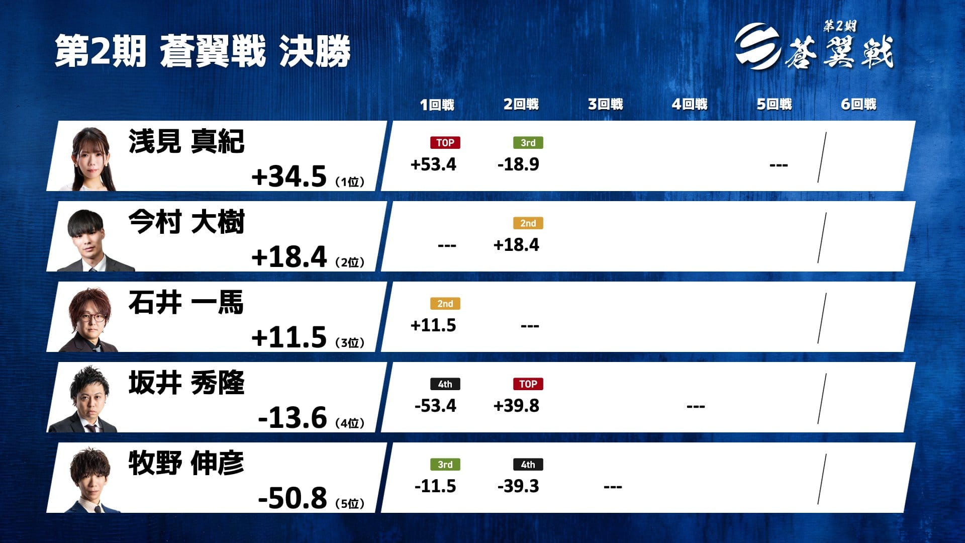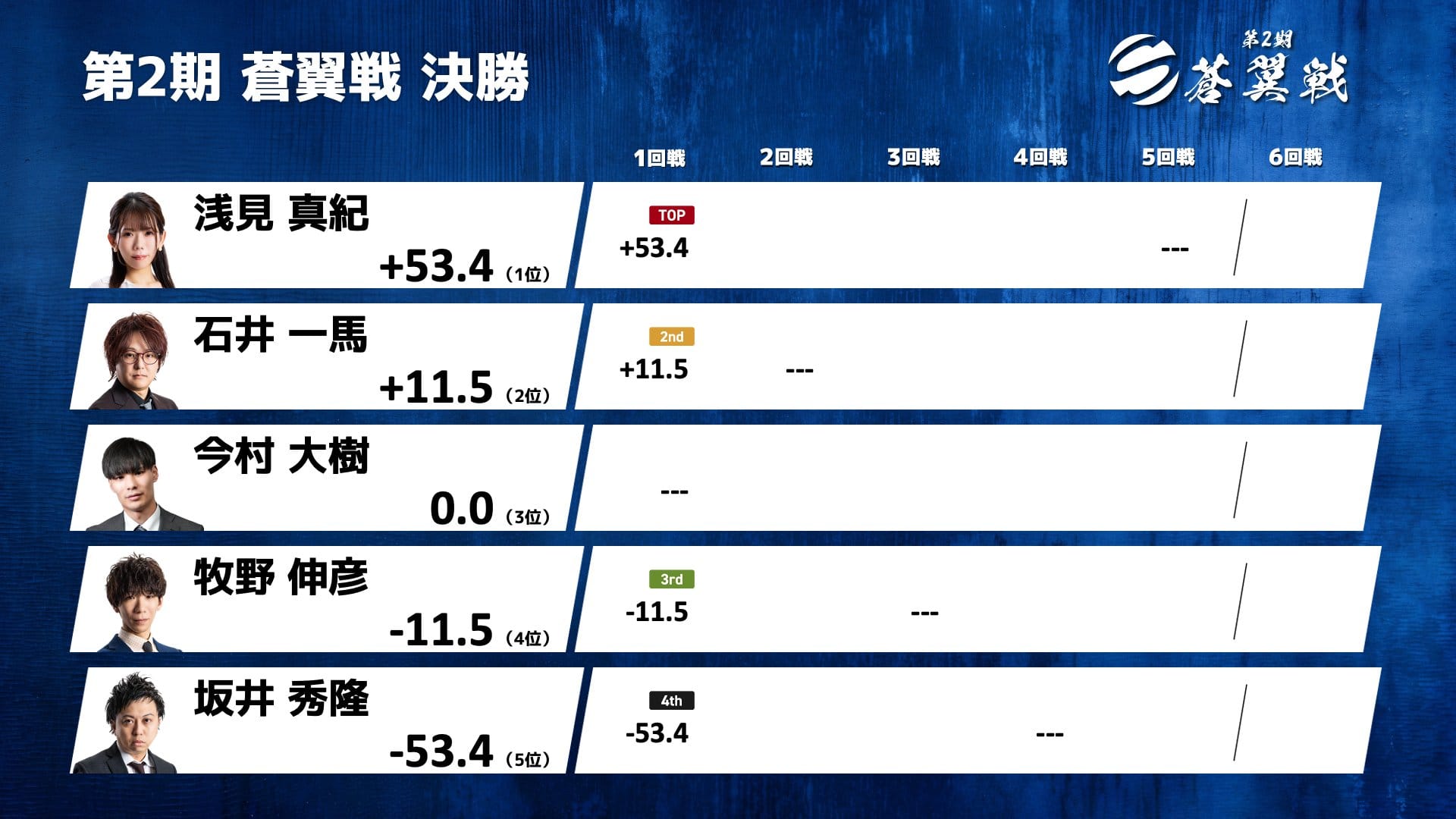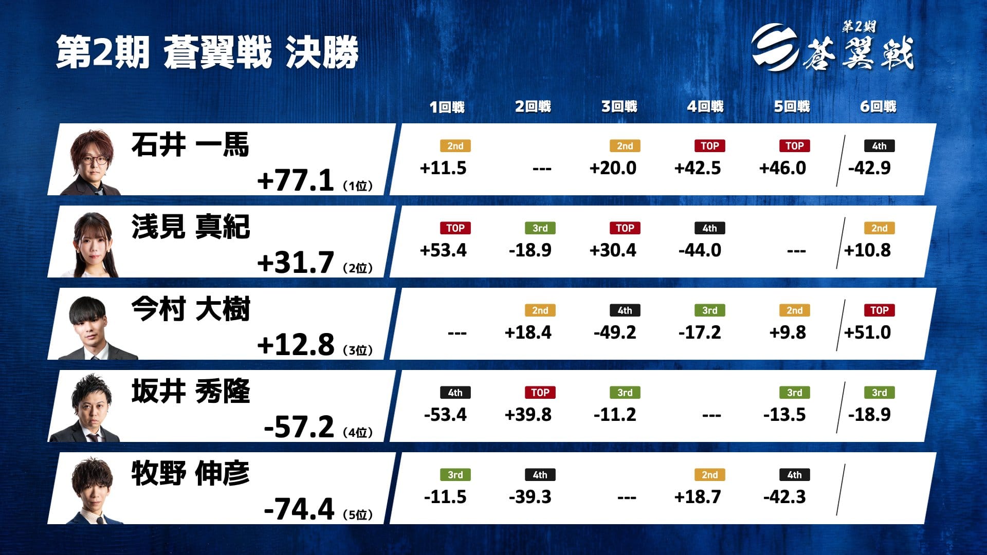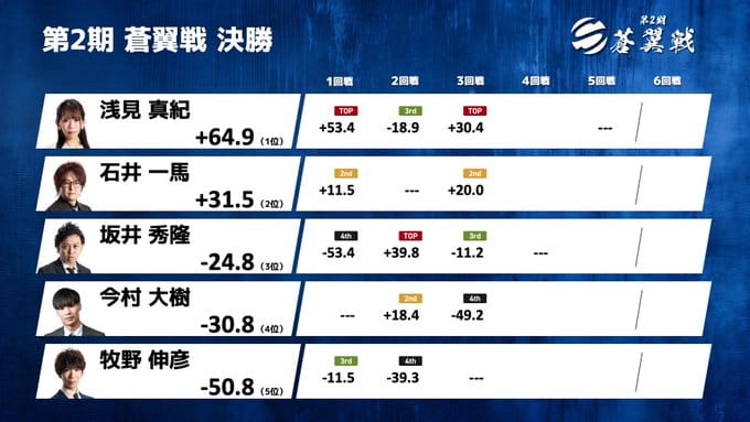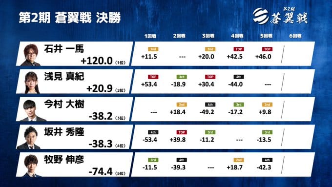 残る4名での最終戦となるが、首位の石井選手と2位の浅見選手との間には約100ポイント近い差があり、トップラスかつ更に大きな素点差が必要となる状況に。