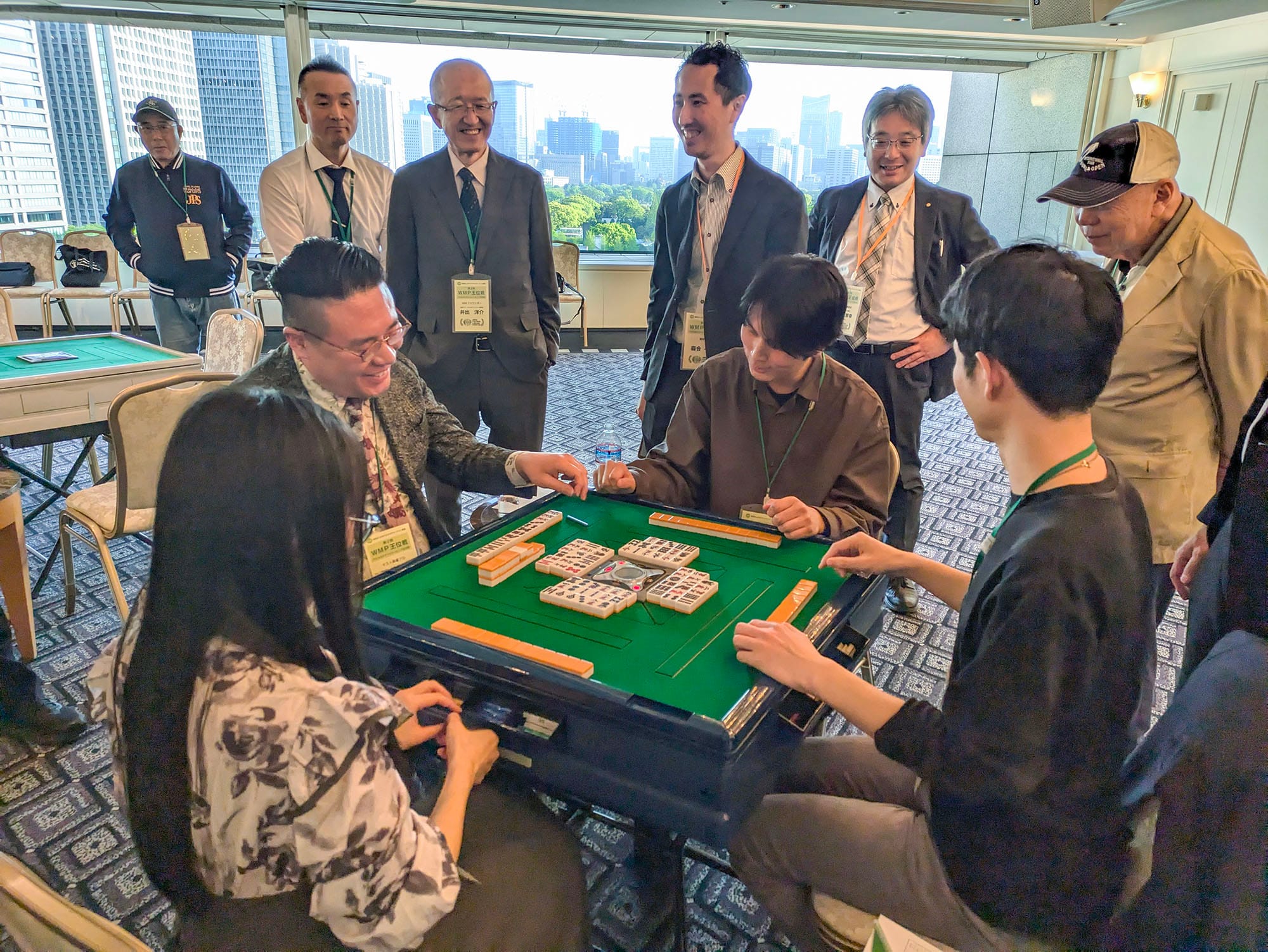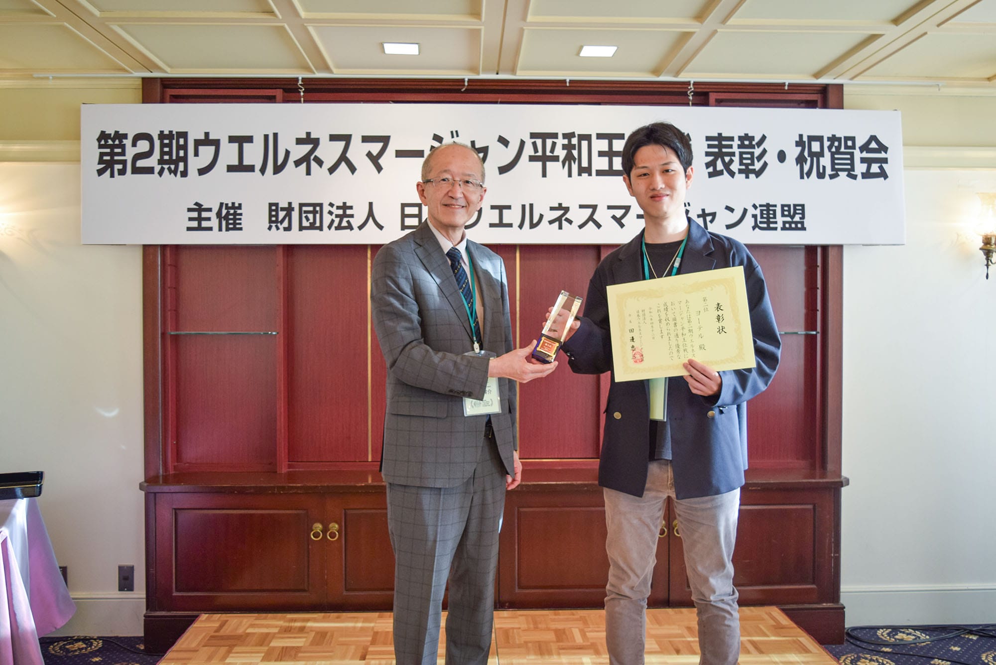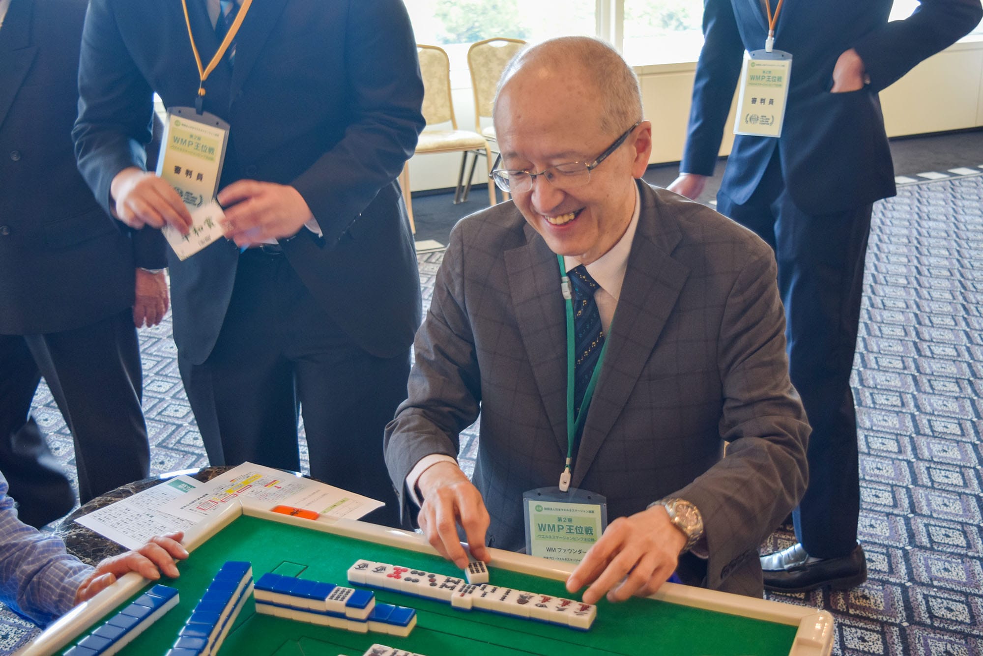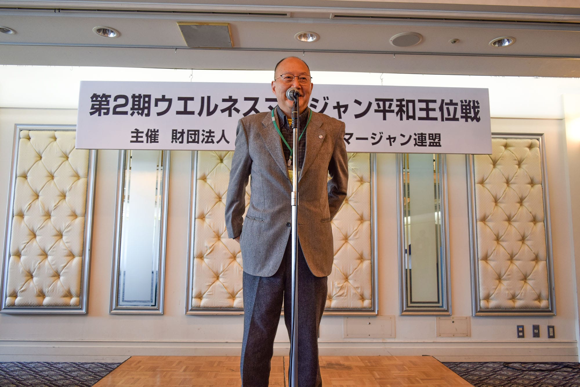 この大会は、日本健康麻将協会名誉会長で今年千代田区の名誉区民となった田邊恵三氏が会長を務める財団法人日本ウエルネスマージャン連盟が主催となり、健康麻雀の次のフェーズとする「ウエルネスマージャン」の理念のもと、マージャンを通じた健全な交流や国際親善、そして麻雀の役の“ピンフ”と「平和」が同じ字な点に着目し、世界平和を祈念したイベント。