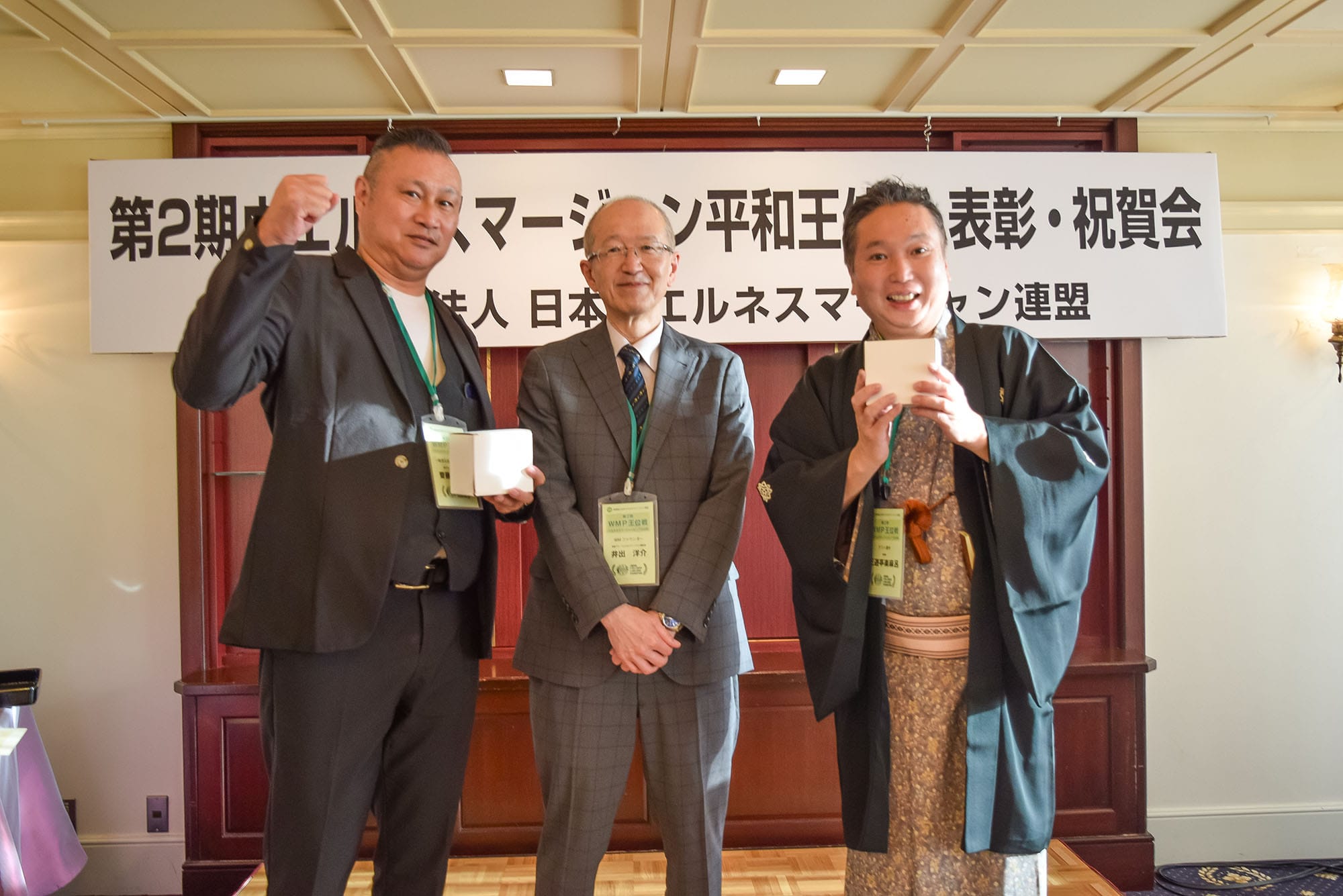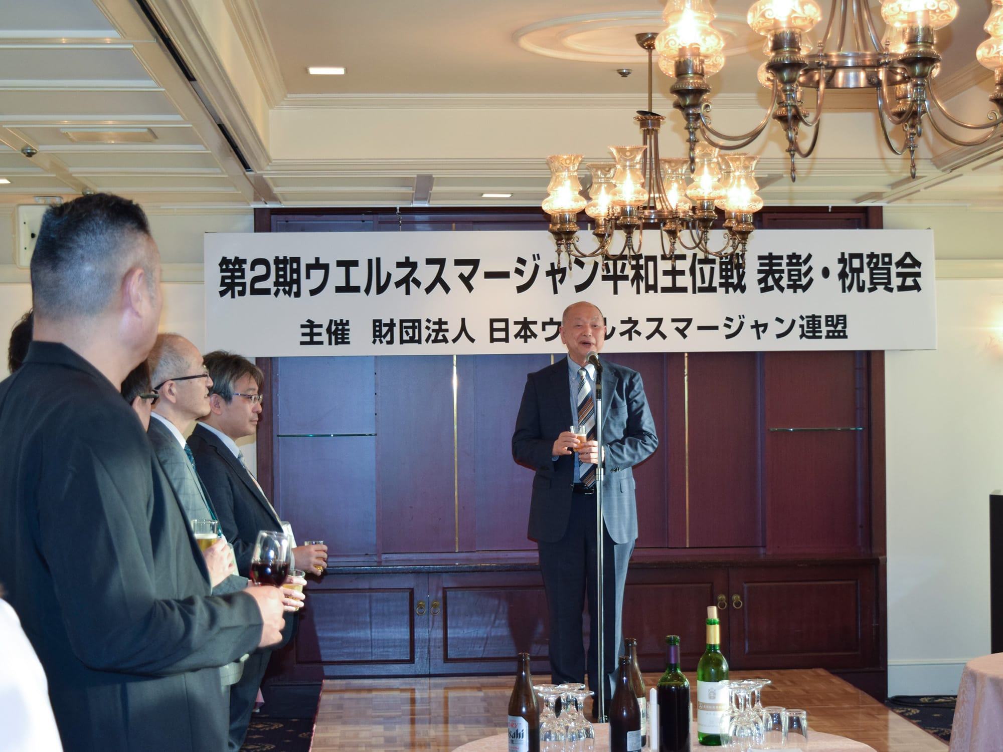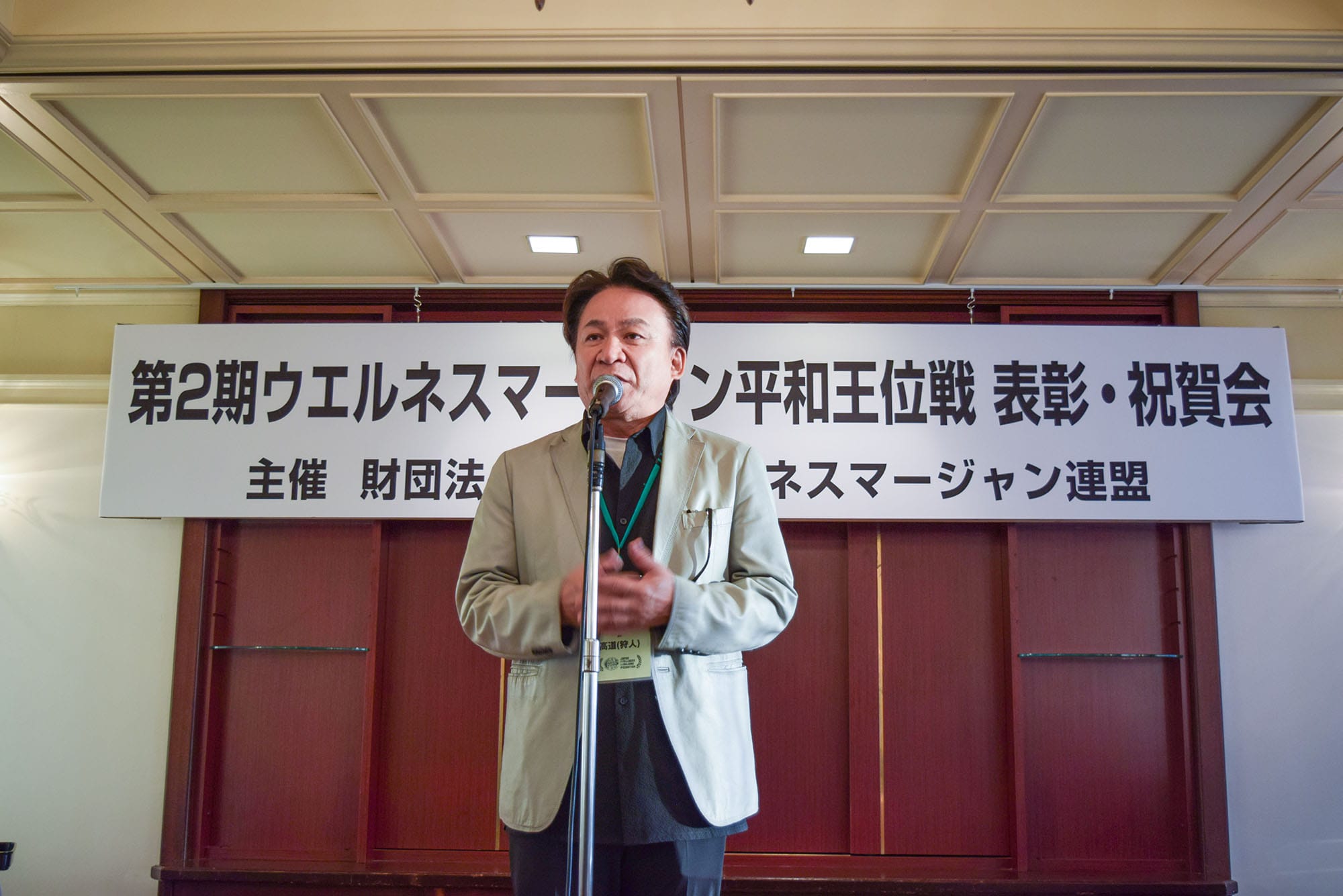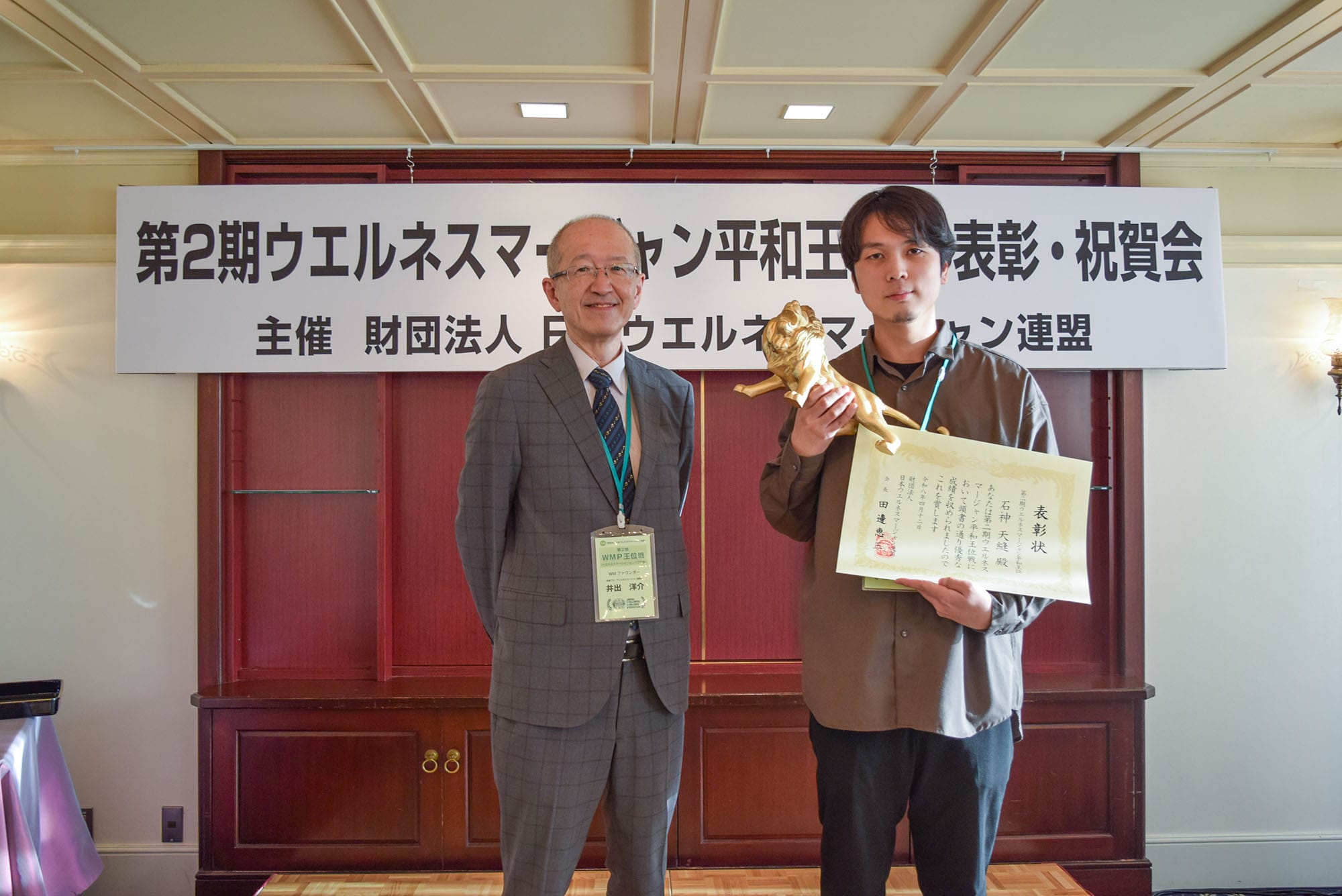 この大会は、日本健康麻将協会名誉会長で今年千代田区の名誉区民となった田邊恵三氏が会長を務める財団法人日本ウエルネスマージャン連盟が主催となり、健康麻雀の次のフェーズとする「ウエルネスマージャン」の理念のもと、マージャンを通じた健全な交流や国際親善、そして麻雀の役の“ピンフ”と「平和」が同じ字な点に着目し、世界平和を祈念したイベント。