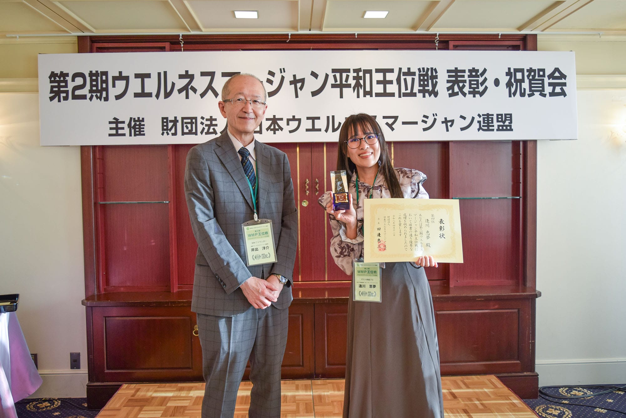 その後、別会場にて表彰・祝賀会が行われ、決勝卓に進出の4名には賞状とトロフィーが贈呈された。