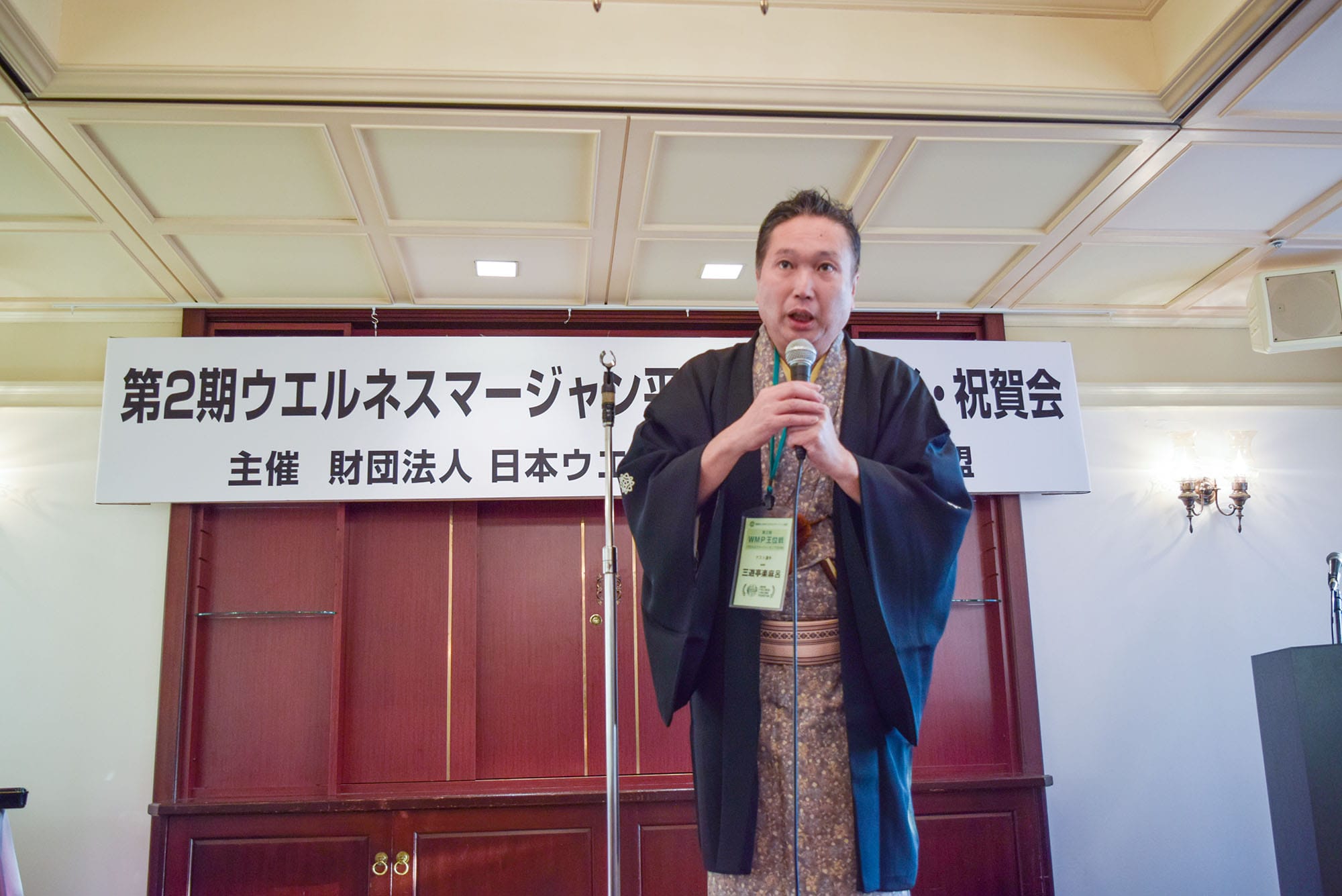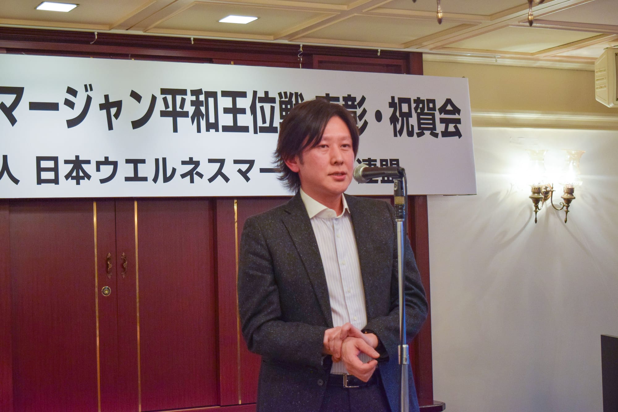 その後の祝賀会では、協力団体である健康麻将全国会の金澤喜重代表理事や日本健康麻将協会の田嶋智徳理事長、歌手の高道(狩人)選手、落語家の三遊亭楽麻呂選手、韓国麻雀連盟・キム・チュンソク選手より挨拶があった。