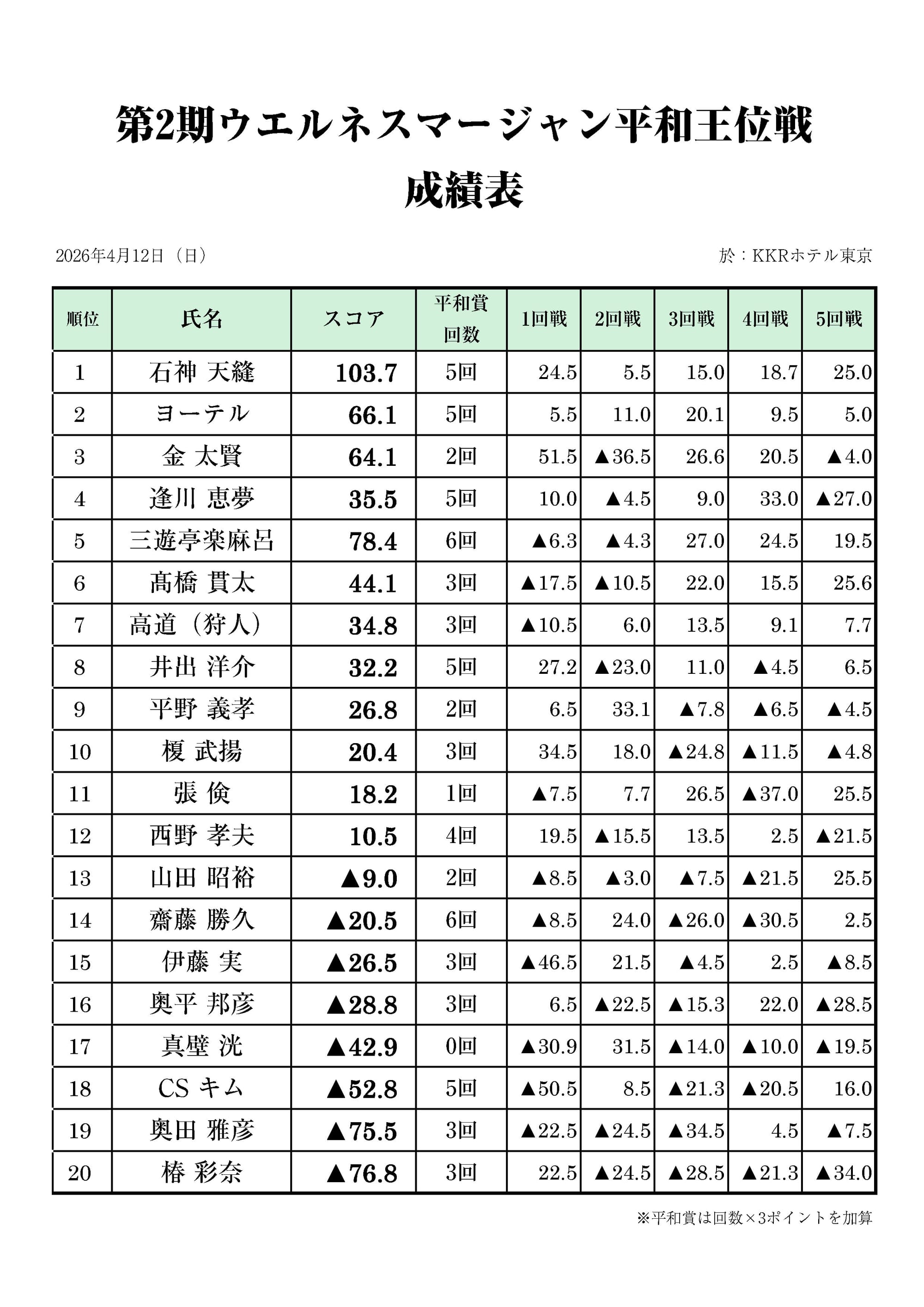 4月12日(日)にKKRホテル東京10階「瑞宝」にて『第2期ウエルネスマージャン平和王位戦』が開催された。